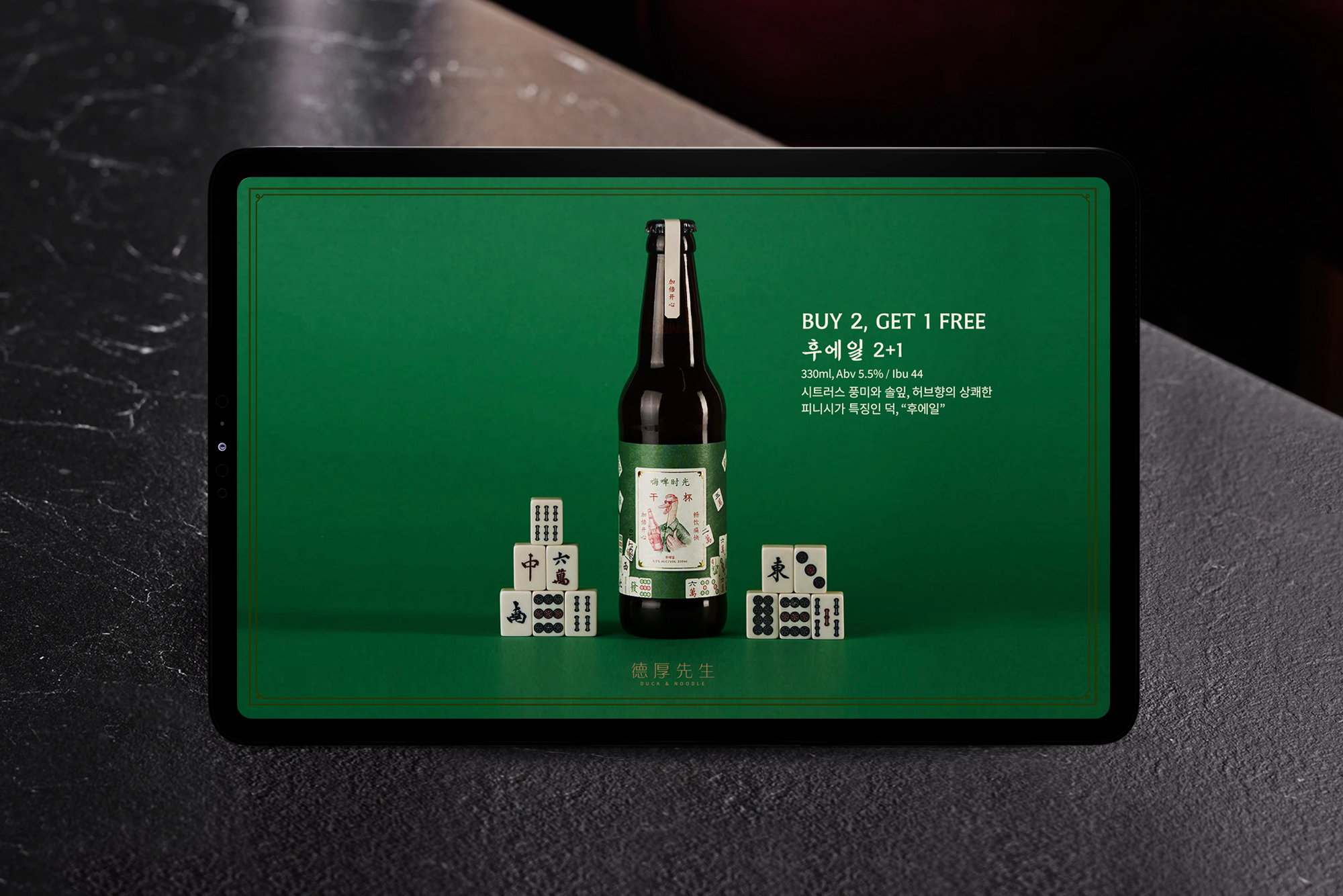 Beer package design for “Duckhoo Sunseng” Restaurant in Seoul. The beer label design was inspired by mahjong, commonly played in Hong Kong.